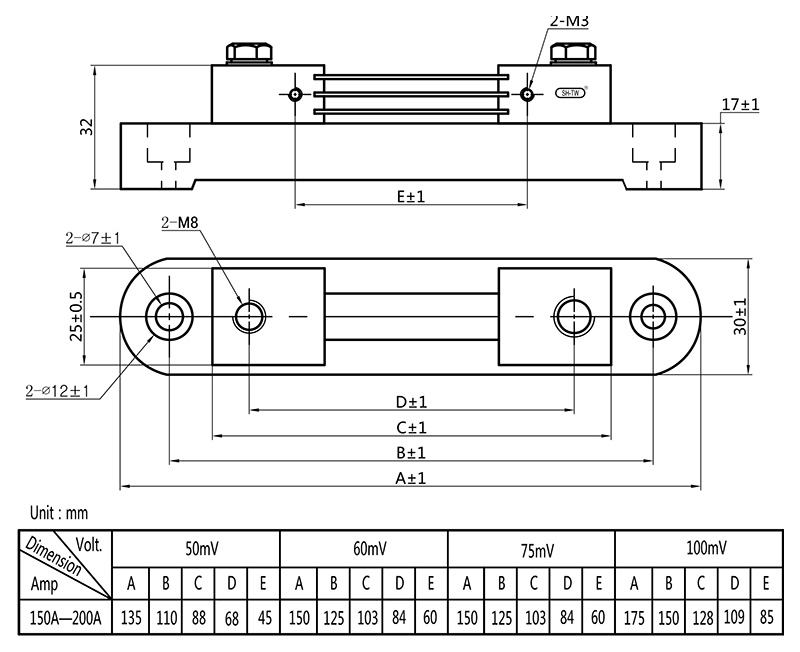 • .Temperature rise: Electrify the shunt with rated current for 2hr, test it after temperature rising stable, the temperature rise should be≤80K when the rated current under 100A; and should be ≤120K when the rated current higher than 100A.
