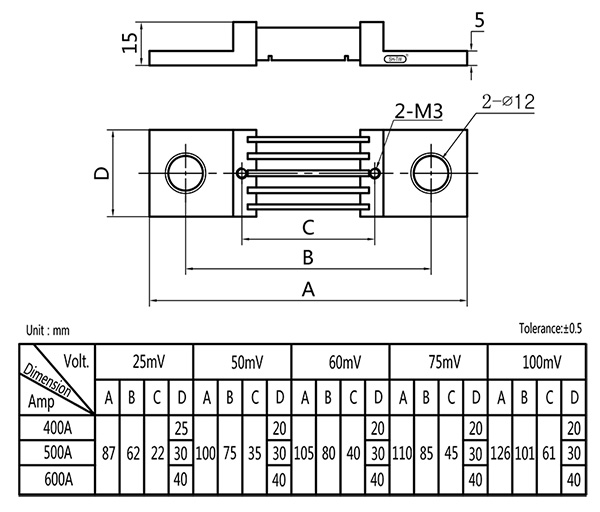 3)Temperature rise: Electrify the shunt with rated current for 2hr, test it after temperature rising stable, the temperature rise should be≤80K when the rated current under 100A; and should be ≤120K when the rated current higher than 100A.