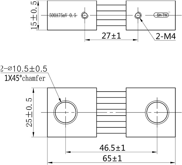 • .Temperature rise: Electrify the shunt with rated current for 2hr, test it after temperature rising stable, the temperature rise should be≤80K when the rated current under 100A; and should be ≤120K when the rated current higher than 100A.