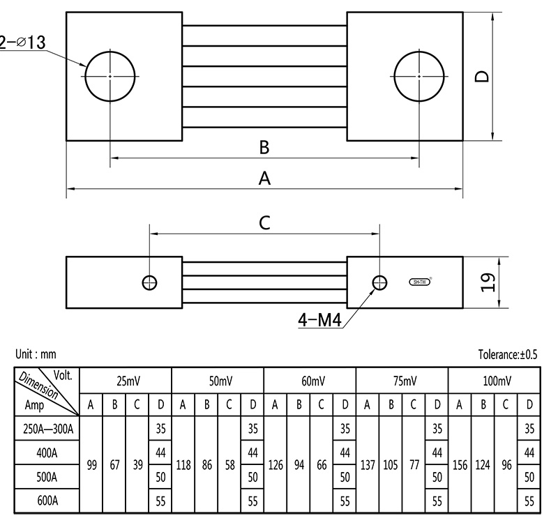 3)Temperature rise: Electrify the shunt with rated current for 2hr, test it after temperature rising stable, the temperature rise should be≤80K when the rated current under 100A; and should be ≤120K when the rated current higher than 100A.