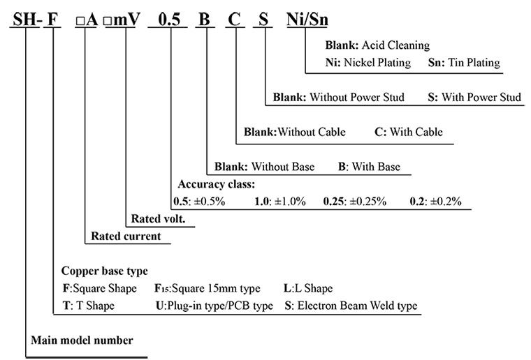 • .Temperature rise: Electrify the shunt with rated current for 2hr, test it after temperature rising stable, the temperature rise should be≤80K when the rated current under 100A; and should be ≤120K when the rated current higher than 100A.