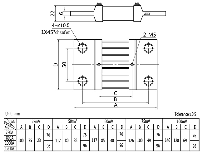 • .Temperature rise: Electrify the shunt with rated current for 2hr, test it after temperature rising stable, the temperature rise should be≤80K when the rated current under 100A; and should be ≤120K when the rated current higher than 100A.